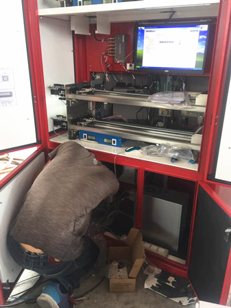 圖為工作人員正在對(duì)發(fā)卡機(jī)內(nèi)部進(jìn)行接線