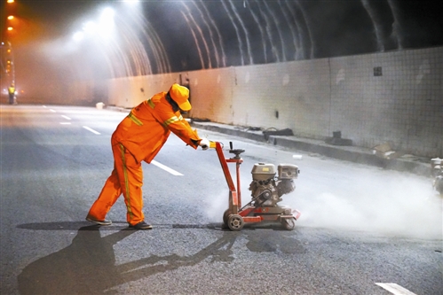 走進(jìn)隧道,一股冷風(fēng)侵襲,洞內(nèi)風(fēng)大又潮。來(lái)自湖北的游師傅,負(fù)責(zé)噴隧道墻面乳膠漆。他有著20多年的豐富經(jīng)驗(yàn),在施工現(xiàn)場(chǎng),他頭戴安全帽,身穿反光背心,緊系安全繩,一個(gè)人站在高高的架子上,底下4名工人不時(shí)緩緩地推動(dòng)登高架。游師傅全然不顧洞內(nèi)的濕冷,大手一揮,熟練而均勻地噴灑著油漆,沒多久墻面便嶄新一片。