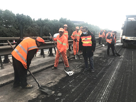 12月4日,難得的晴好天氣,甬臺溫高速公路臺州段一期路面專項養(yǎng)護攤鋪現(xiàn)場,工人緊張而忙碌作業(yè)。施工一旁,另有三位身著反光背心、頭戴帽子、腳穿布鞋的人員正目不轉睛地注視著攤鋪機作業(yè),時不時指點工作,他們是集團路面專項養(yǎng)護綜合督查組成員邵克、馮濟爐和葉榮江。
