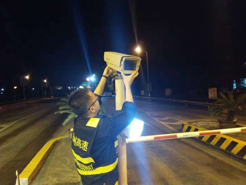 圖為工作人員在調(diào)整攝像頭角度 沿線車牌抓拍率的大幅提升,在短時(shí)間內(nèi)打了一個(gè)“翻身仗”,顛覆了之前在省排名落后的形象。 項(xiàng)寅曉