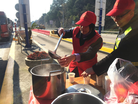 當(dāng)天是入冬以來最冷的一天,收費崗?fù)ぶ車鷼鉁剡_到零下4度。該所員工身穿耀眼的“紅馬甲”,面帶微笑,在車道安全島內(nèi)搭起臨時“便民服務(wù)臺”,頂著嚴(yán)寒為過往司乘人員遞上一杯杯滾燙的姜茶與紅豆湯,并提醒司機朋友天冷注意保暖。