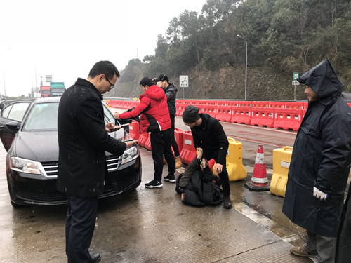 31日是春運的前一天,下起了今年的第一場大雪。當天10:30分左右,三號車道如往常一樣正常、有序,該車道正在檢查綠農車。這時一輛牌照為浙JVIT6*黑色小轎車緩緩駛入,突然該車加速調整方向,想朝二號車道沖去。與此同時從它后方快速沖出一輛轎車檔在了該車前面,接著后方又沖出一輛黑色轎車,攔截在該車后方的去路。兩輛車上跳下幾個大漢,以迅雷不及掩耳之勢,一擁而上干脆利落的將車內三名犯罪嫌疑人控制。 當班收費員被這一幕驚呆了,不過迅速反應過來,啟動應急預案,呼叫監(jiān)控員,監(jiān)控員在監(jiān)控視頻中發(fā)現(xiàn)這個情況后,第一時間通知所長。所長孫明偉得知情況后立即趕赴現(xiàn)場,確認核實身份,并令當班班長第一時間聯(lián)系當?shù)嘏沙鏊藢嵣矸?。在得到明確的答復后,工作人員立刻封閉該車道,為民警辦案提供方便,并打開備用車道正常收費疏導過往車輛,組織人員疏散圍觀群眾避免車輛和人員停留過多影響民警辦案。