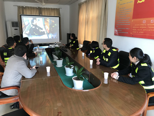 圖為考察小組人員在會(huì)議室觀看文明服務(wù)錄像