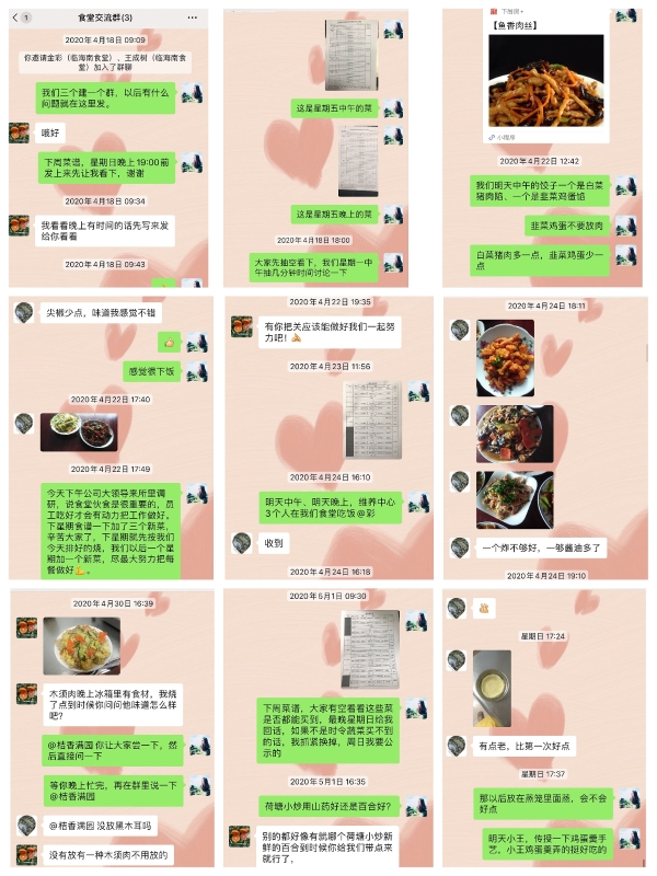圖為建立食堂交流群 今年4月中旬,所務陳瑩利用微信建立了食堂交流群,經(jīng)常在群里上傳從網(wǎng)上、廚房APP上下載的一些簡單又美味的家常菜制作方法。并結合食堂人員的特長,針對季節(jié)變換,合理調整飲食,做到葷素搭配、飯菜每班一日三餐不重樣等要求,提前列出每周菜譜,要求食堂人員根據(jù)菜譜,每周針對創(chuàng)新家常菜,提前準備少量食材,精心燒制,待嘗試滿意后再供應。