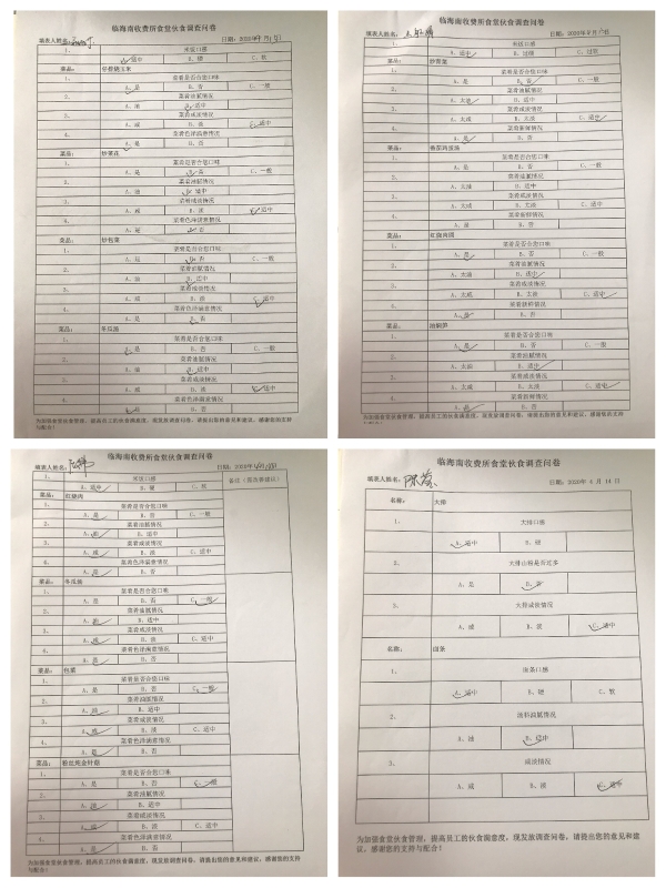 圖為伙食調查表 為了提高食堂滿意度,該所從菜肴口味、油膩度、咸淡、色澤等方面制定調查問卷,讓大家真實客觀地表達各自的想法和建議。問卷調查采用當班用餐人員實名填寫問卷調查表的形式進行,通過收集的問卷,每天中午定期召集食堂人員,反饋前一天的調查結果,根據(jù)員工的反饋建議,討論制定整改措施,確保將員工的意見及建議落到實處。除此之外,每逢傳統(tǒng)佳節(jié),定制相應的節(jié)日菜譜,保證員工在站所也能感受到節(jié)日的喜慶和家的溫馨。 通過一個月的實施反饋來看,總體結果比較滿意。兩位廚師也都表示,今后要努力改善菜肴質量和服務水平,嚴把食堂飲食安全關,提高食堂各項工作的質量,經(jīng)常性地與員工溝通,力爭讓每位員工滿意,做員工放心食堂。