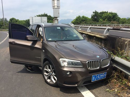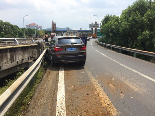 8月13日上午10:30分左右,臺州收費所出口寧向匝道口有一輛黑色寶馬X3斜靠在護(hù)欄旁,其車頭左側(cè)因碰撞護(hù)欄而嚴(yán)重凹陷,左前輪胎報廢。
