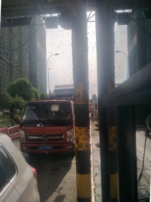 原來這輛綠通車運輸蜂箱,由于蜂箱沒有關閉嚴實,在車通過車道檢查稍作停留時,大量的蜜蜂乘機逃出,圍攻收費崗亭,天空瞬間一片密密麻麻。它們有的停留在車道的防撞柱上,有的在收費窗口附近盤旋,遲遲不肯離開,嚇得過收費站等待繳費的司機不敢開車窗繳費。