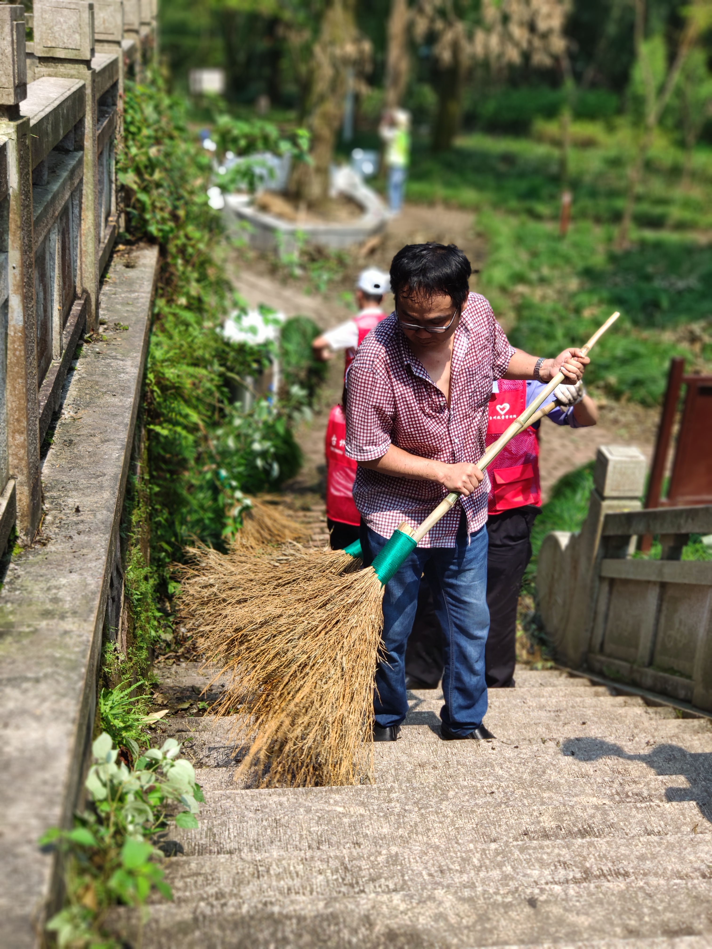 圖為打掃現(xiàn)場 上午8點(diǎn)半左右,志愿者們帶著掃把、鐵鍬等工具到達(dá)九峰公園,在黃巖青年志愿者的帶領(lǐng)下,來到劃分的平臺區(qū)塊。受9號臺風(fēng)“利奇馬”影響,公園內(nèi)不少樹木倒地,枯葉遍地。志愿者們帶著手套,用掃把、鐵鍬將平臺區(qū)域內(nèi)堆積的落葉和樹枝進(jìn)行裝袋清理。小的樹枝用草繩捆扎;拿不動的樹枝,用鋸子鋸斷了抬走;鐵鍬不好裝袋,就用手去捧。烈日酷暑下,志愿者們不顧汗流浹背,經(jīng)過兩個(gè)多小時(shí)的努力,共清理出40多袋垃圾,大家用雙手還公園一片美。