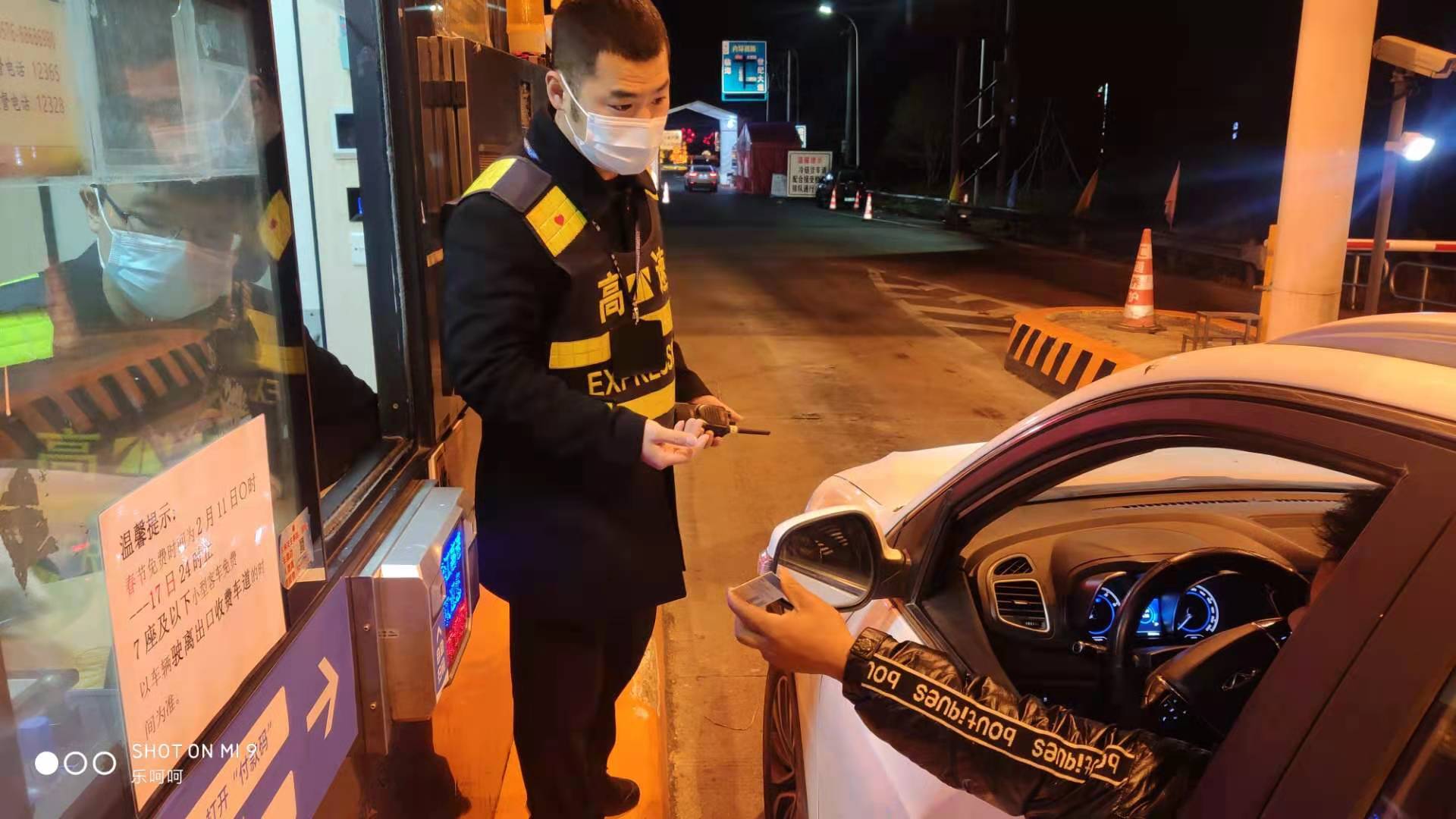 春節(jié)假期,高速公路免收通行費(fèi)時(shí)間從2月12日0點(diǎn)開(kāi)始至2月18日0點(diǎn)結(jié)束,在免費(fèi)通行結(jié)束的最后一刻,常有司機(jī)不清楚免費(fèi)政策而停留在車(chē)道上,為了保證車(chē)道暢通,18日0點(diǎn)開(kāi)始,收費(fèi)所領(lǐng)導(dǎo)帶領(lǐng)行政人員在車(chē)道上跟這些司機(jī)耐心解釋溝通。