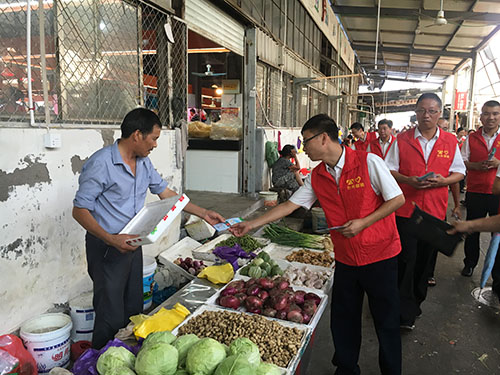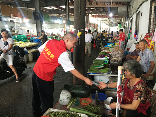 圖為志愿者在菜場宣傳垃圾分類 志愿者們特地選取菜市場、商鋪等人多且容易產(chǎn)生垃圾的地方,向店主和商販們宣講環(huán)境公害引發(fā)的負面后果及如何處理平時的生活垃圾,他們結合宣傳冊通俗、耐心地講解生活垃圾要從源頭開始分類投放:干濕要分開,對剩菜剩飯、瓜皮果殼等易腐垃圾要瀝干水分,投放后要蓋好垃圾桶,免得蚊蠅滋生;紙類、飲料瓶、金屬等有再生利用價值的要放在可回收的垃圾桶里;對電池、電子產(chǎn)品、殺蟲劑、油漆桶等含有害化學物質的要單獨放;剩余的作其它垃圾處理。
