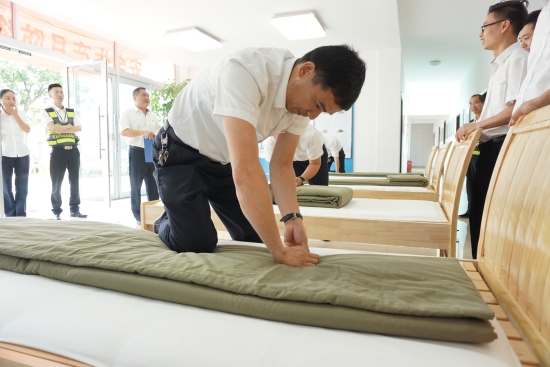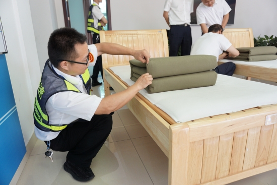 圖為比賽現(xiàn)場 活動現(xiàn)場,裁判宣布比賽規(guī)則及打分標(biāo)準(zhǔn):評分從被子整體形狀、平整度、棱角明顯、折疊時間等方面判斷,規(guī)定在5分鐘內(nèi)完成,共設(shè)置一、二、三等獎三個獎項。內(nèi)務(wù)半軍事化在該所已是常態(tài),參賽選手們很快進(jìn)入狀態(tài),從鋪到疊再到整,駕輕就熟,均能在規(guī)定時間內(nèi)整出“豆腐塊”。評委現(xiàn)場進(jìn)行點評和打分。經(jīng)過競逐,最后副站收費四班何翊平奪得一等獎。比賽分四輪進(jìn)行,且全程用時不到1個小時。
