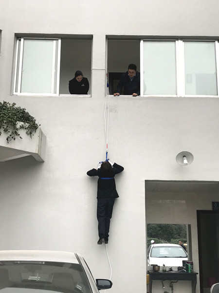 圖為高處逃生演練現(xiàn)場 理論培訓結束后,溫嶺西收費所隨即開展實地逃生演練,讓員工學習使用逃生繩從高處逃生的技能。在蔡教官的指導下,一名收費員大膽地自我推薦,主動嘗試此自救方法。 一切準備就緒,該收費員迅速爬上窗戶,利用逃生繩小心地沿著墻壁下滑,并順利落地。教官最后根據(jù)演練情況作點評。 此項技能有助于在火災時多開辟一條逃生通道,減少人員傷亡。 通過此次全面的培訓演練,溫嶺西收費所將全力共抓消防安全工作,排除各類隱患。 鄭霞霞