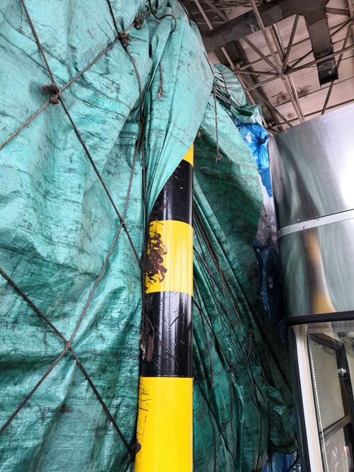 在與司機溝通后,工作人員用剪刀剪開篷布及尼龍網,司機和陳軍用工具頂住貨物防止貨物墜落。經過近20分鐘的努力,終于將篷布與防撞柱分離。