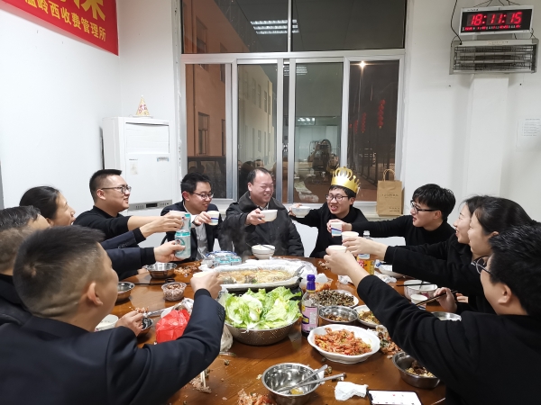 1月30日傍晚,溫嶺西費(fèi)所二班成員齊聚 在單位食堂,為小壽星洪燈杰舉辦了一場(chǎng)簡(jiǎn)單而又有意義的生日宴會(huì)。