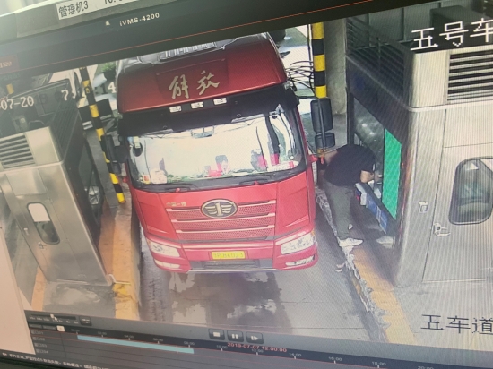 圖為失主遺落錢財(cái)現(xiàn)場 當(dāng)天上午,收費(fèi)班長李寧巡查時在第五車道窗口附近發(fā)現(xiàn)了三百元現(xiàn)金,經(jīng)多方確定不是所內(nèi)工作人員遺失后,判斷為過往司機(jī)不小心遺失。為了盡快找到失主,李寧隨即去監(jiān)控室調(diào)取視頻查找。 經(jīng)過監(jiān)控查找,馬上鎖定了一輛車牌為“豫”字開頭的大貨車。原來當(dāng)時因駕駛室距離窗口較遠(yuǎn),司機(jī)下車付錢,監(jiān)控中清晰顯示司機(jī)在掏錢繳費(fèi)時三百塊現(xiàn)金從口袋里掉到車道上,但是司機(jī)因?yàn)橼s路絲毫沒有發(fā)覺。確認(rèn)失主后,工作人員查詢司機(jī)電話并取得聯(lián)系,告知其遺失三百現(xiàn)金,在通過微信確認(rèn)身份后,李寧將錢轉(zhuǎn)給了司機(jī)。