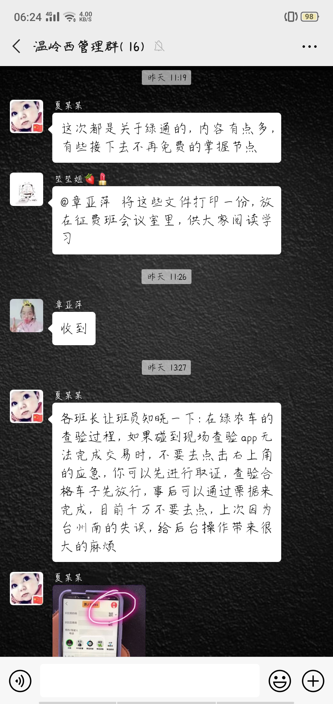 圖為需要學習的各個文件內(nèi)容 培訓采取集中學習與線上學習相結(jié)合,理論知識與現(xiàn)場操作相結(jié)合、互動交流與相互提問相結(jié)合的方式開展,通過釘釘、微信等學習平臺,每天,各班班長組織班員開展崗前五分鐘提醒、崗后班組集中學,確保每一名收費人員能夠熟練掌握新收費系統(tǒng)的各項操作流程。此外,各班班長及時梳理匯總收費員們在實際操作中遇到的問題,并上傳至管理群,群中全員參與,一起討論學習。遇到無法解決的問題時,所負責人第一時間與上級主管部門溝通,以尋求最佳解決方案,并發(fā)布到群里,明確操作流程和統(tǒng)一相關(guān)政策解釋工作。 本次培訓不僅使全所每一位員工鞏固了前期業(yè)務(wù)知識,也更加深入掌握了收費新系統(tǒng)的操作流程以及新收費政策,為恢復正常收費穩(wěn)步進行奠定了堅實的基礎(chǔ)。 鄭霞霞