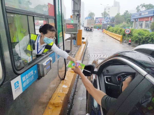 圖為收費(fèi)員向過往司乘發(fā)放宣傳單