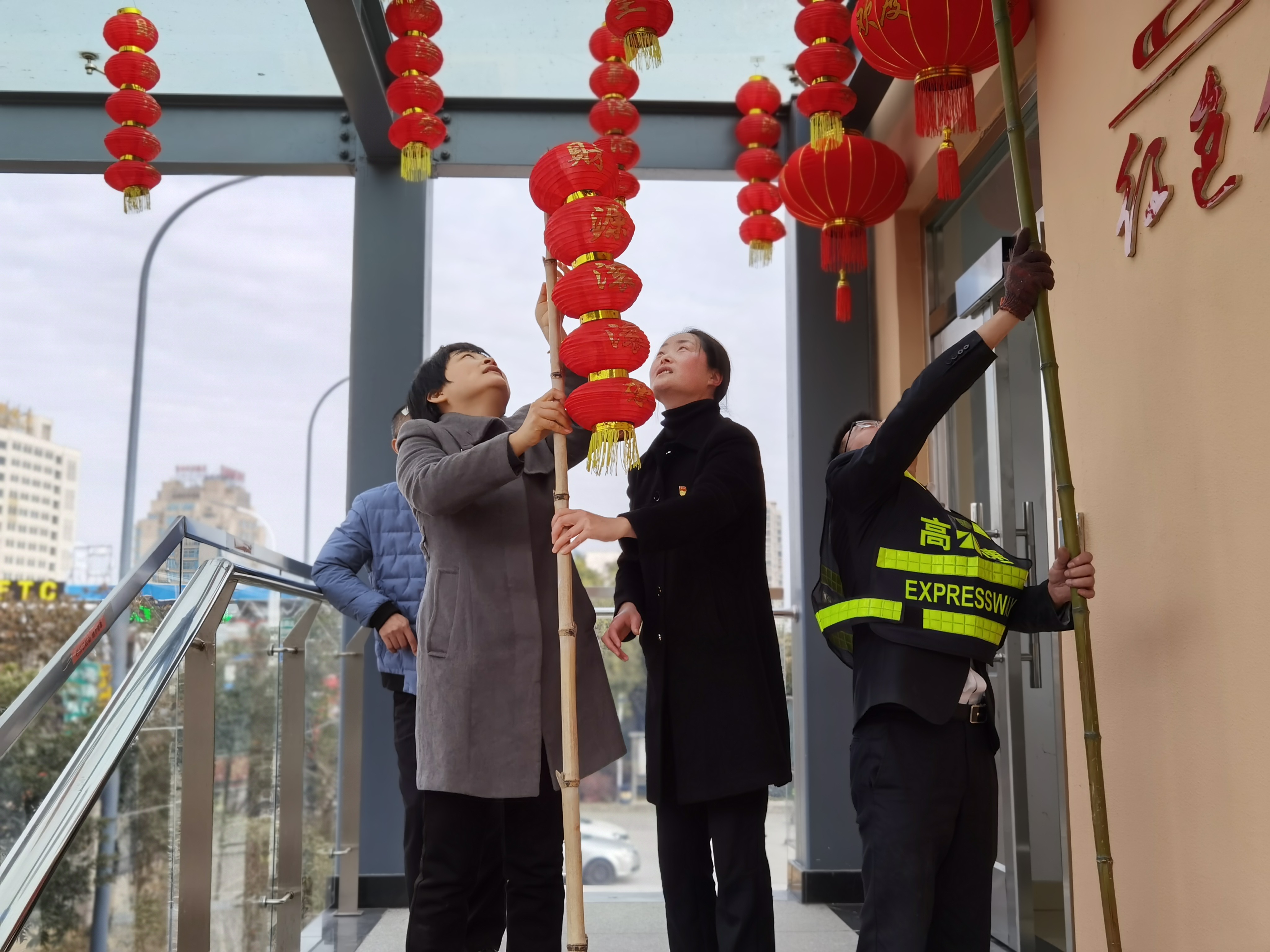 大家分工合作,搬梯子、遞春聯(lián)、貼膠帶、校正高低。在站所內(nèi)每個(gè)角落都掛上了紅彤彤的燈籠;收費(fèi)區(qū)域內(nèi)廣場(chǎng)兩邊的欄桿上扎著一面面彩旗。一幅幅精致喜慶的對(duì)聯(lián)、“?!弊?,一串串三角彩旗,一個(gè)個(gè)大紅燈籠把整個(gè)收費(fèi)站所點(diǎn)綴得處處洋溢著濃厚的節(jié)日氛圍,“年味”十足,讓在站員工和過(guò)往司乘朋友感受到新年的喜慶氛圍和“家”的溫暖。