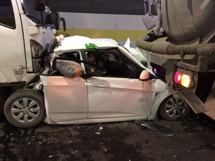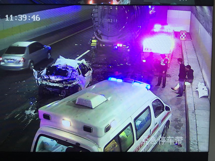 圖為事故現(xiàn)場 情況緊急,一接到指令,巡邏車立即在南廣場調頭,趕赴事故現(xiàn)場。而此時較大的車流量已造成后方堵車,導致巡邏車被堵在隧道口,執(zhí)勤隊員怕時間耽擱太久,便火速跑到事故現(xiàn)場,第一時間將車里的人員救出。所幸轎車內四人只有一人腳上受傷,中控立即拔打120急救電話。在他們還在施救的時候,追尾事故卻頻頻發(fā)生,500米左右、1300米左右的超車道上先后發(fā)生兩小車、三車追尾事故,隧道內排起了長龍。為了保證在最短時間內恢復正常通行,執(zhí)勤隊員忙著奔赴現(xiàn)場指揮預警,應急救援有序展開。 現(xiàn)場,監(jiān)控中心、交警、執(zhí)勤隊等部門分工協(xié)作,整個施救過程一直持續(xù)到中午12點多才順利完成。盡管執(zhí)勤隊員到現(xiàn)在都滴水未進,但每個人臉上繃緊的神經(jīng)終于都得到了放松。 林玲
