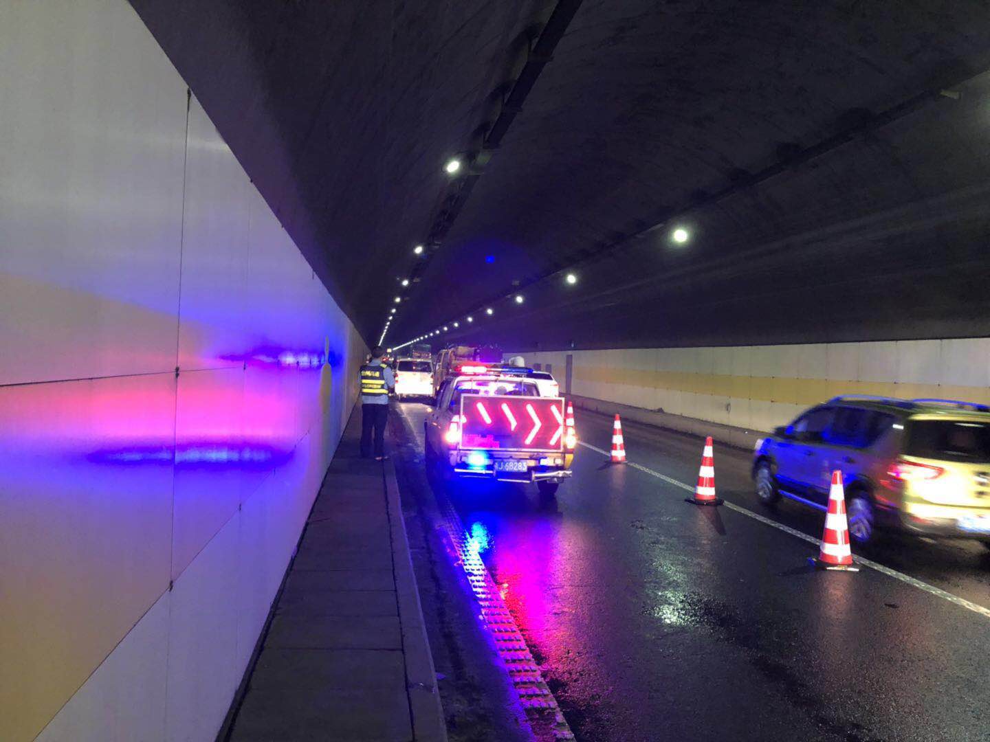 7月14日19時22分,中控員朱金飛發(fā)現(xiàn)黃土嶺寧向隧道1000米快車道處有車拋錨。立刻呼叫執(zhí)勤隊前往處置,隨即更改快車道交通信號。 執(zhí)勤隊迅速出警,幾分鐘后就趕赴事故現(xiàn)場,發(fā)現(xiàn)一輛白色面包車撞在隧道內(nèi)右側(cè),車輪箍嚴(yán)重受損,卡在護(hù)溝里,所幸無人員受傷。執(zhí)勤隊進(jìn)行提前預(yù)警,預(yù)防二次事故的發(fā)生,并呼叫高速施救車輛支援,幾分鐘后施救車抵達(dá),事故車輛安全拖離隧道,僅僅十分鐘,交通就恢復(fù)暢通。