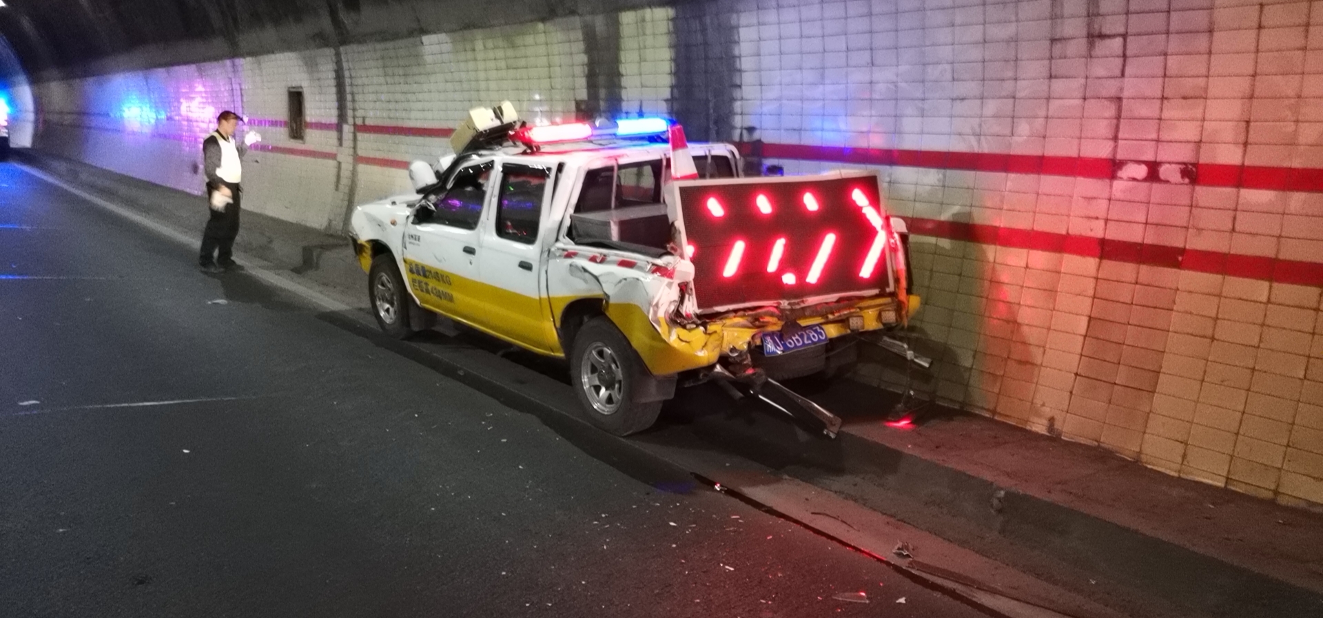 圖為事故車輛 憑著多年積累下來的經(jīng)驗,洪瑞立刻判斷該車肯定存在異常情況,趕緊使用巡邏車內的廣播反復呼叫,提醒貨車靠邊停車檢查,并將此情況反饋到中控室。然而貨車并未停下,為了確保貨車的安全,巡邏車開啟警示燈,拉起警報,給該車預警。 當車行駛到馬鬃嶺隧道時,執(zhí)勤隊員從后視鏡發(fā)現(xiàn)后方有另一輛大貨車正快速逼近,沒有任何減速的傾向。這一刻,留給他們的只有兩個選擇:往左拐,時間緊張,一個處置不當,會出現(xiàn)尾部被撞后再次追尾前方貨車的前后夾擊險情,后果不堪設想;或者在被撞時的一瞬間采取正確的應對措施,在操作時絕不能有一丁點的遲疑,逃生的時機僅有幾秒鐘。 生死存亡的緊急關頭,隊員們及其冷靜,被猛烈撞擊時,沒有急踩剎車、誤打方向,在左側車道有車的情況下,處置正確、分毫不差,往右車道偏移了10來米,成功從夾縫中逃脫,化解了這次險情。巡邏車被撞后,兩名受傷隊員不顧傷痛,仍然堅持下車保護現(xiàn)場并對來往車輛預警,預防二次事故的發(fā)生,直到后續(xù)救援力量到達。 此次事故造成三車追尾,兩名執(zhí)勤隊員輕微受傷,雖然巡邏車損失慘重,但是因為執(zhí)勤隊員高度的工作責任心和對險情的正確判斷處置,才未造成任何司乘人員的傷亡,也未影響到隧道正常通行。 據(jù)隧道所員工了解,該貨車司機可能是凌晨疲勞駕駛沒有聽見巡邏車預警,在此提醒廣大司機,車輛如果發(fā)生故障,車靠邊、人撤離,即報警,切忌疲勞駕駛! 盧祖理