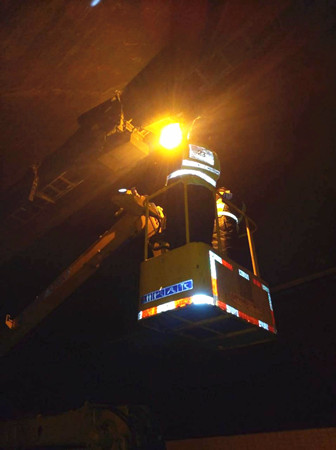大溪嶺隧道所在險情發(fā)生的第一時間作出緊急措施,兩名執(zhí)勤隊員在溫向隧道洞口卡口預警,李立巍向維養(yǎng)中心調(diào)來登高車,三名電工隨即進隧道維修脫落的燈罩。經(jīng)過25分鐘的快速搶修,目前設備已能正常使用,隧道恢復通行。