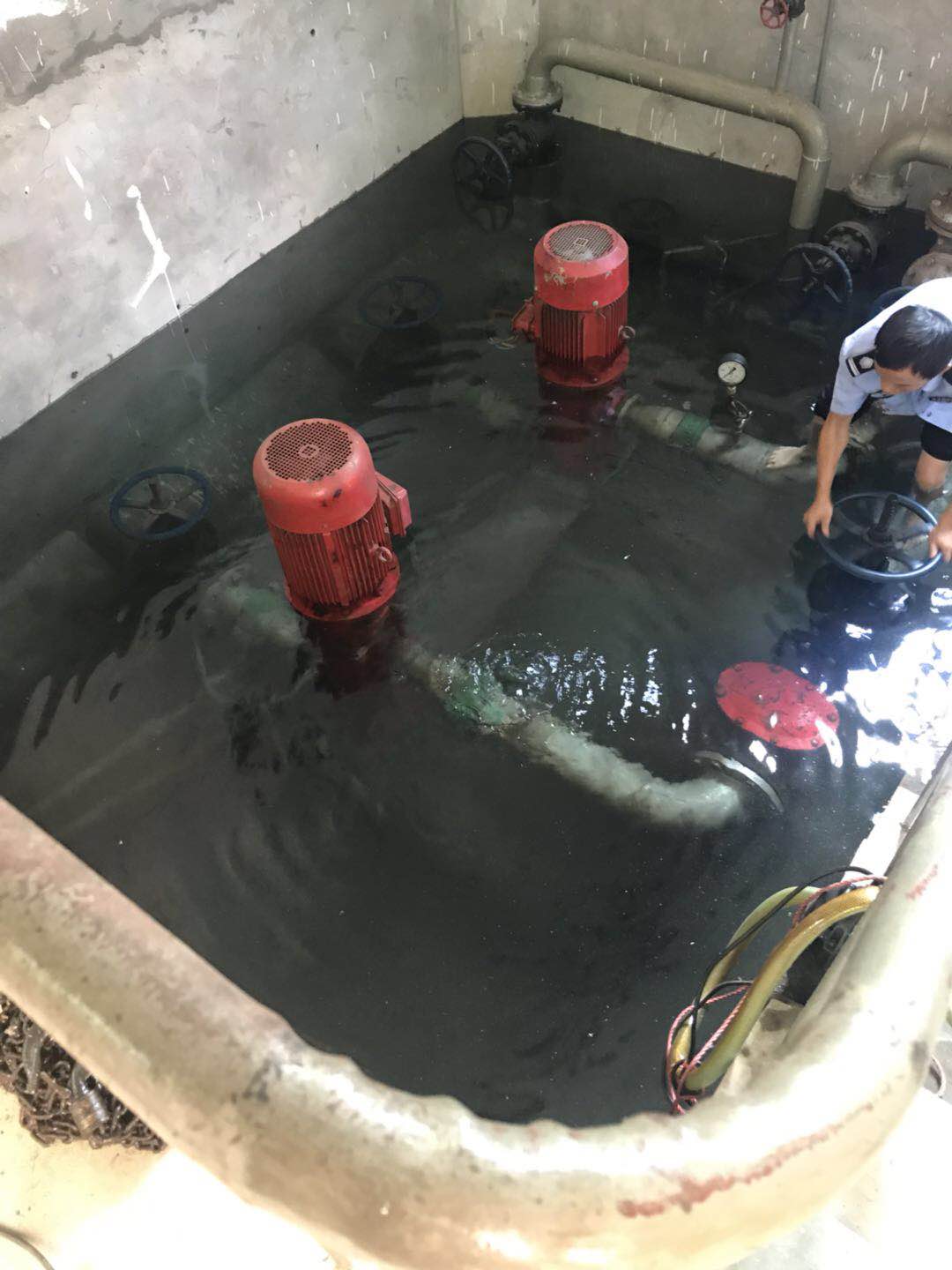 此時,陳旦平?jīng)]有多想,立即下水去關(guān)閉水泵閥門。池中有2號泵的高位水池閥門和2號泵的集水池閥門,每個泵各有兩個閥門。陳旦平在迅速關(guān)閉閥門后,由于集水池這邊地勢較低,慌忙中的他忘拿手機,手機被水浸到,他卻依舊埋頭于搶修。