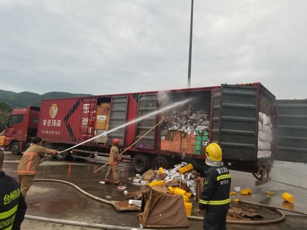 萬(wàn)幸的是,恰逢溫州高速交警巡邏車(chē)經(jīng)過(guò),隨即在該貨車(chē)后方預(yù)警,很快的所巡邏車(chē)、消防車(chē)先后到達(dá)現(xiàn)場(chǎng)協(xié)同滅火。由于該車(chē)貨物較多,且裝載物皆為紙箱和塑料,集裝箱底層溫度較高,一時(shí)只能將明火撲滅,但車(chē)廂內(nèi)仍有大量煙霧,為了安全,車(chē)子必須盡快撤離隧道,執(zhí)勤隊(duì)當(dāng)即決定讓駕駛員把車(chē)開(kāi)往南廣場(chǎng)繼續(xù)滅火,消防車(chē)則一路緊隨其后滅火,以防火勢(shì)變大。