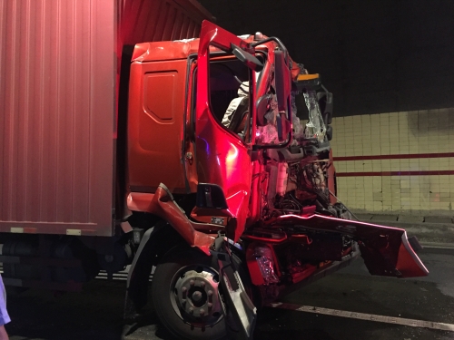 圖為事故車輛 接警后,執(zhí)勤隊員立即奔赴現(xiàn)場,做好車輛預(yù)警工作。現(xiàn)場兩輛廂式貨車停在慢車道上,后貨車的副駕駛室被擠壓得嚴重變形,幸好副駕駛位置無人,否則后果不堪設(shè)想。受傷的司機坐在電纜溝上,右手臂一直流血,意識清醒。見司機受傷,隊長通知中控員撥打救護車。前車已經(jīng)停在電纜溝上,但是車輛不能移動,隊員們向司機詢問之后才了解,前車漏機油,兩車都需要拖車。隊員們一邊在隧道內(nèi)疏通交通一邊在等候救護車和拖車,16:26分,救護車到達現(xiàn)場將受傷司機帶走,17:50分,拖車將兩輛事故貨車拖離,現(xiàn)場恢復通車。該起事故造成隧道內(nèi)車輛緩行兩個小時,期間封道十多分鐘,事故原因是前車有故障緩慢行駛,因無任何警示標志,后車沒有注意而造成追尾。 在此提醒各位司機朋友,由于隧道內(nèi)外亮度不同,進入隧道請?zhí)崆伴_燈減速慢行,在行車過程中要注意前面路況,發(fā)現(xiàn)有問題及時減速慢行,并保持安全車距。如遇突發(fā)狀況,車子無法正常行駛時,為了自已和他人的安全,請及時報警并做好相應(yīng)警示標志,防止二次事故的發(fā)生。 陳旦平