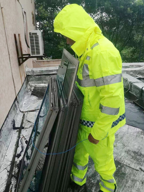 圖為工作人員捆扎散落的物品 8月9日上午,超強(qiáng)臺(tái)風(fēng)帶來強(qiáng)降雨,大溪嶺隧道所隊(duì)員們做好一切防臺(tái)準(zhǔn)備,備好發(fā)電機(jī)所需燃油,保證所有車輛車況良好并加滿油;充分備好繩索、應(yīng)急燈、雨衣雨靴、藥品、食物等防臺(tái)物資;檢查各類通訊線路,確保內(nèi)部通訊電話、報(bào)警電話等重要線路暢通;放下北廣場的二高桿燈。隊(duì)員們爬到屋頂,對(duì)散落的物品進(jìn)行捆扎,并疏通堵塞的排水管,確保排水設(shè)施良好。所有人員全力做好防臺(tái)部署工作和防御措施,確保大溪嶺隧道一切設(shè)備正常運(yùn)行,隧道平安暢通。 陳智慧
