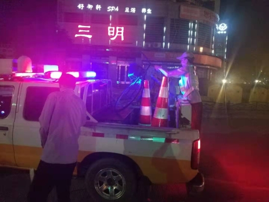 圖為執(zhí)勤隊(duì)發(fā)現(xiàn)騎車人 9月24日21:09分,大溪嶺隧道所中控室發(fā)出通知。執(zhí)勤隊(duì)員接中控指令,迅速出警。晚上九點(diǎn),在高速公路上找人,需得打上12分的精神,巡邏車放慢車速,坐于后座的隊(duì)員們緊盯著車道兩旁,終于在21:14分,距離寧向隧道出口一公里處發(fā)現(xiàn)該騎車男子,隊(duì)員們立即上前將其攔住。眼前的一幕令執(zhí)勤隊(duì)員嚇出一身冷汗,該男子左手殘疾,單手騎車,晚上視線模糊,且高速公路上車多,速度快,司機(jī)很難發(fā)現(xiàn)有行人,如發(fā)現(xiàn)躥出來的行人而采取緊急制動,會造成多起追尾事故,現(xiàn)場情況非常危險(xiǎn)!隊(duì)員們合力將自行車抬上車。