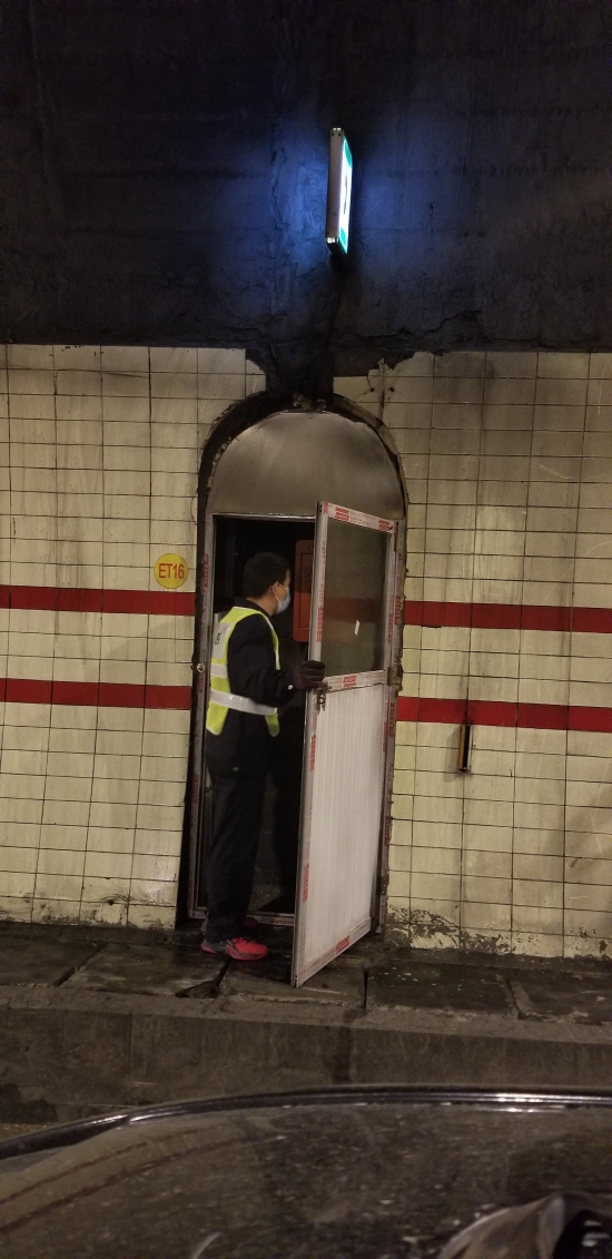 圖為工作人員在檢修緊急電話 此次隧道清洗,隧道所員工加班加點(diǎn),檢查隧道內(nèi)消防箱、檢修隧道風(fēng)機(jī)和加強(qiáng)燈回路、修理故障的語音提示,對(duì)配電房機(jī)電設(shè)備進(jìn)行除塵保養(yǎng),還檢測了火災(zāi)報(bào)警、緊急廣播、緊急電話等系統(tǒng)。