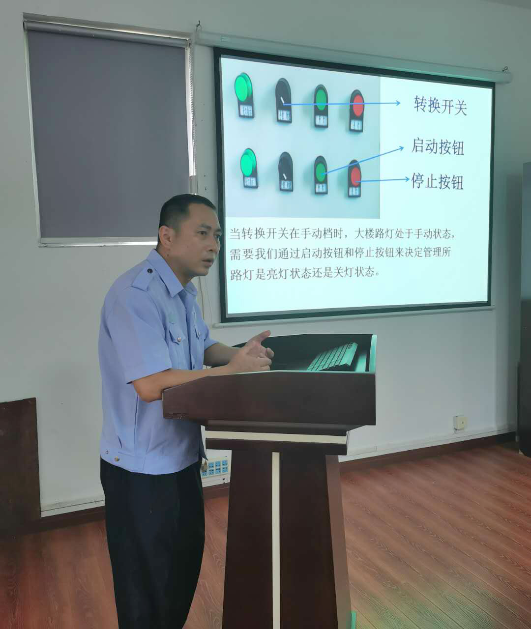 湯寧光在電工崗位已經(jīng)19載,有著豐富的工作經(jīng)驗(yàn)。他用聊家常的方式來講解線路控制的工作原理圖、電路的故障排除方法、光控開關(guān)的接線方法,PPT課件中配隧道所配電房中相應(yīng)的照片和線路圖,并注解,簡潔明了,通俗易懂。在授課過程中,他每講到一處結(jié)尾,便與聽課人員互動(dòng),現(xiàn)場為大答疑解惑,課堂氛圍熱烈,互動(dòng)感很強(qiáng)