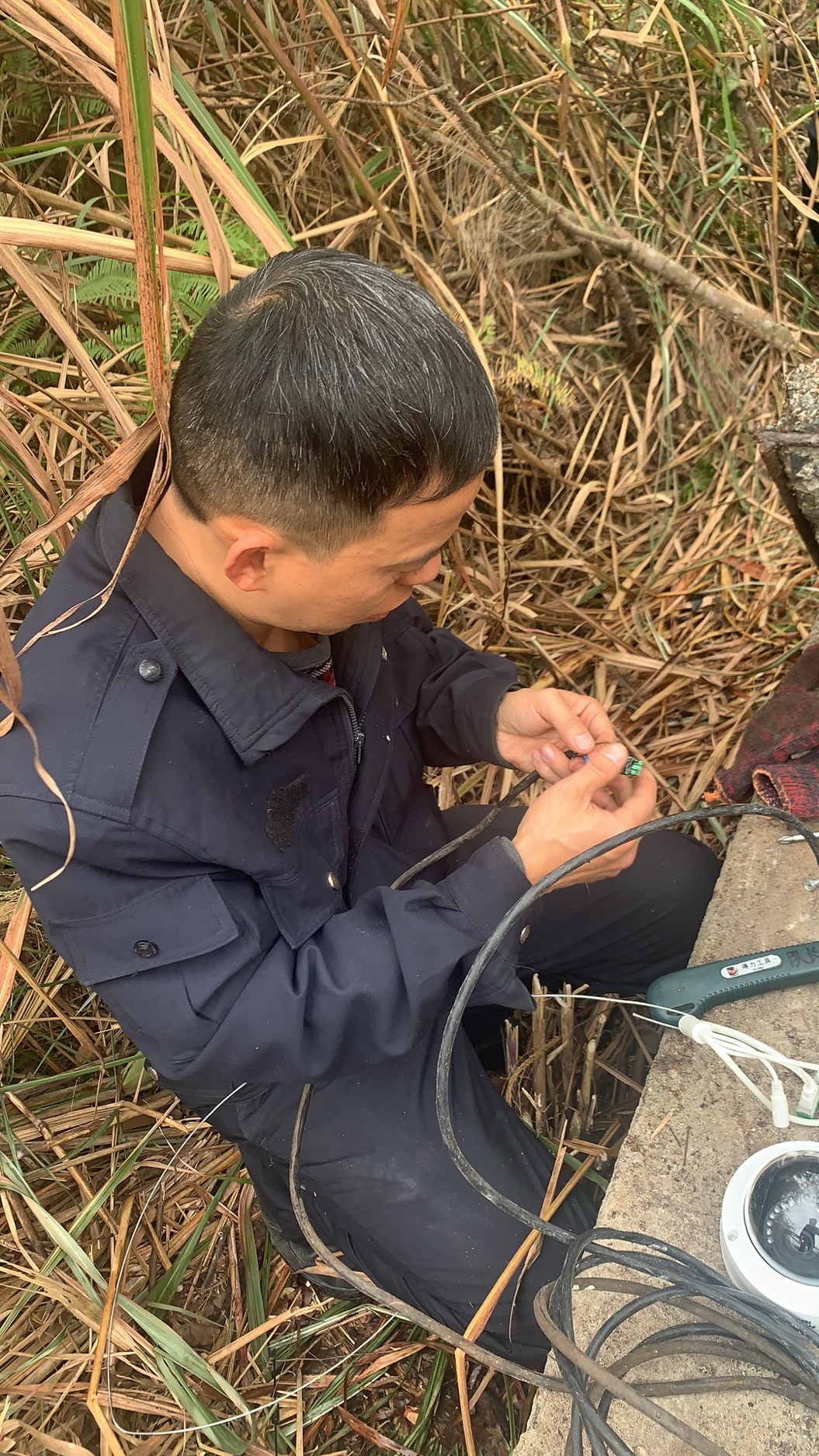 大溪嶺南高位水池地點在溫州地界,山體較高,攀行需要近一個小時,金所得知情況后,立即帶著執(zhí)勤隊上山到高位水池檢查,他們背著工具箱,戴著手套、拿著柴刀,經(jīng)過一個小時的披荊斬棘來到南高位水池的井口,金所爬到井里進(jìn)行檢查,發(fā)現(xiàn)光纜和電線都被老鼠咬斷了,才導(dǎo)致圖像不能工作,當(dāng)場把電線接了回去,并回所準(zhǔn)備其他材料,明日再次登山修理。