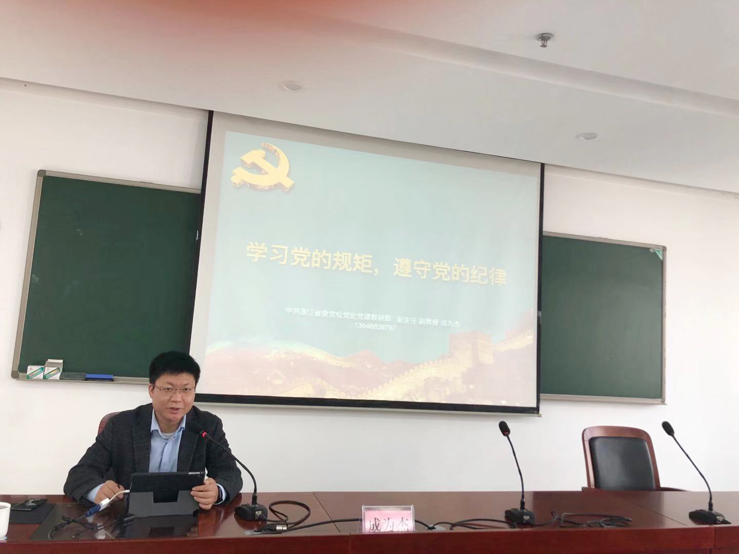 圖為省委黨校黨史黨建教研部副主任、副教授、博士成為杰以《學習黨的規(guī)矩 遵守黨的紀律—黨章黨規(guī)黨紀解讀》為題授課