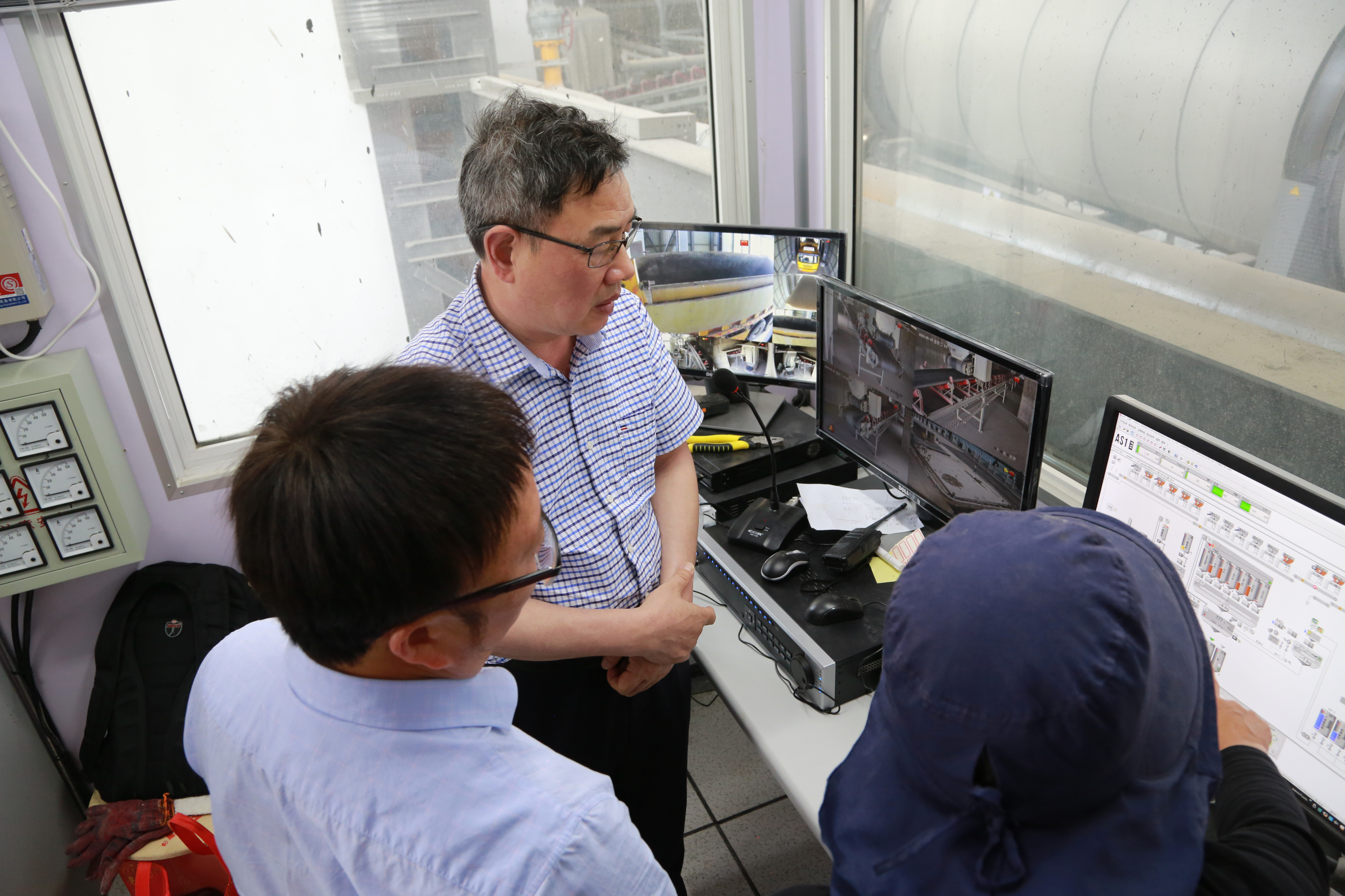 圖為陳文波一行在山海公司瀝青拌合站現(xiàn)場調(diào)研