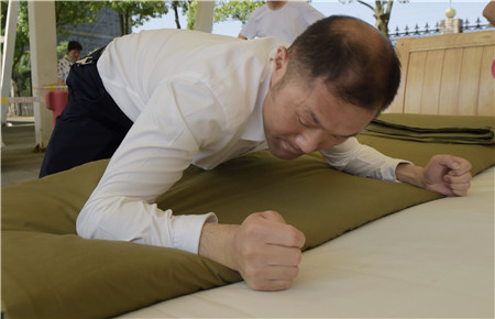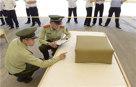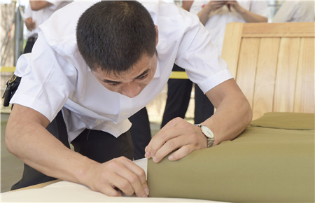 教官用手量量被子上下厚度,四周細(xì)細(xì)觀察,在兩床“豆腐塊”被子之間反復(fù)來回查看了幾遍,又與另一個(gè)教官指指點(diǎn)點(diǎn)商量了好久,不僅是參賽者,圍觀者都開始緊張了。確實(shí),按照內(nèi)務(wù)整理要求,這兩床已被疊成豆腐塊的被子折得有棱有角,被面光滑,上下勻稱,外行人看來就是一模一樣的完美,沒有任何區(qū)別了?!白屗麄兌紩x級(jí)吧?!迸杂^者說。教官笑著搖搖頭,對大家解釋道:“3號(hào)床勝出,因?yàn)樗请p面折法,在規(guī)定時(shí)間內(nèi)兩面修整程度都一樣平整,這樣比起來,5號(hào)床稍遜一籌?!?/span>