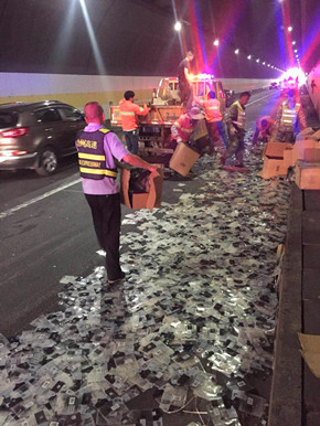 6月3日14時17分,黃土嶺隧道寧主車道一輛小貨車碰撞電纜溝后,火花四濺、塵土飛揚地撞向主車道箱式貨車,小貨側翻橫在主車道上,運載的物品被全部甩在車道散落一地,事故現(xiàn)場凌亂不堪。