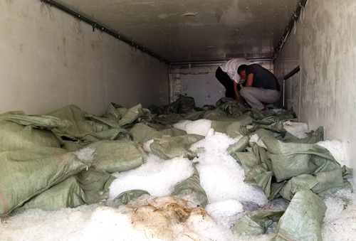 李貴陽打開車輛后廂門,迎面撲來一陣?yán)滹L(fēng),一眼望去車廂里面全部是一袋袋的花蛤,上面還壓著袋裝的冰塊和零碎的碎冰,車廂內(nèi)部看不清楚。憑借多年的工作經(jīng)驗和認(rèn)真負(fù)責(zé)的工作態(tài)度,李貴陽二話沒說,直接爬上濕滑的車廂,踏過冰袋和碎冰,深入到車廂里面去檢查,把冰袋掀開后,結(jié)果發(fā)現(xiàn)下面全部是空桶。原來這樣做既可以增加貨物面積也可以使重量加重,從而達(dá)到綠農(nóng)政策的免費通行要求。