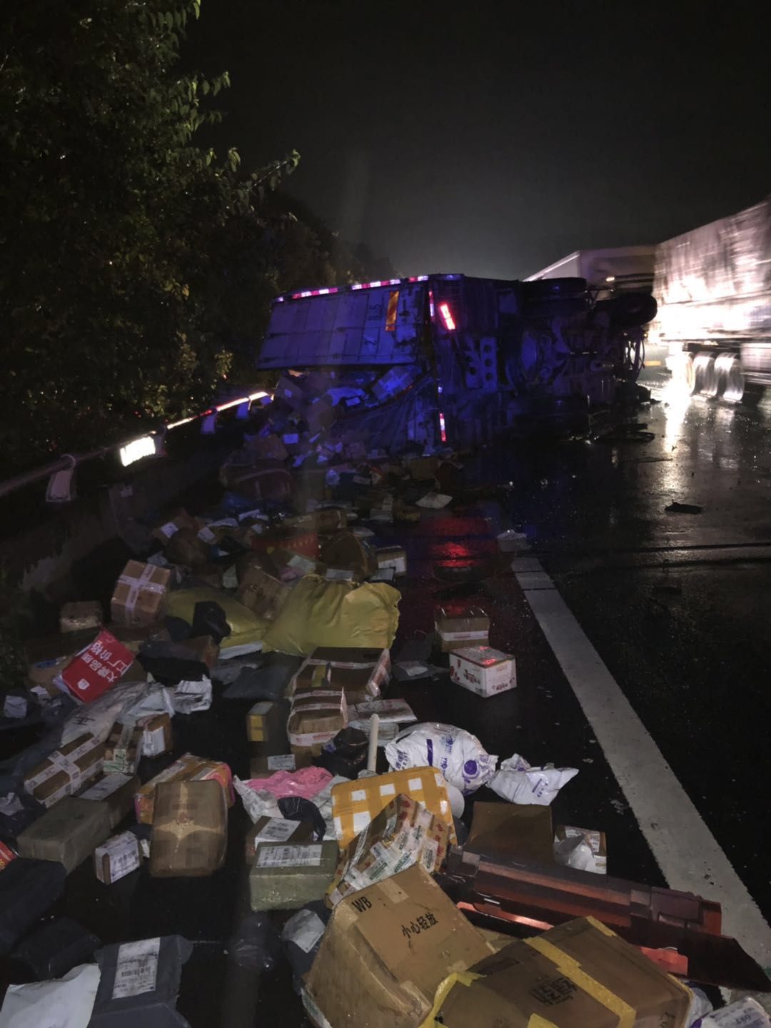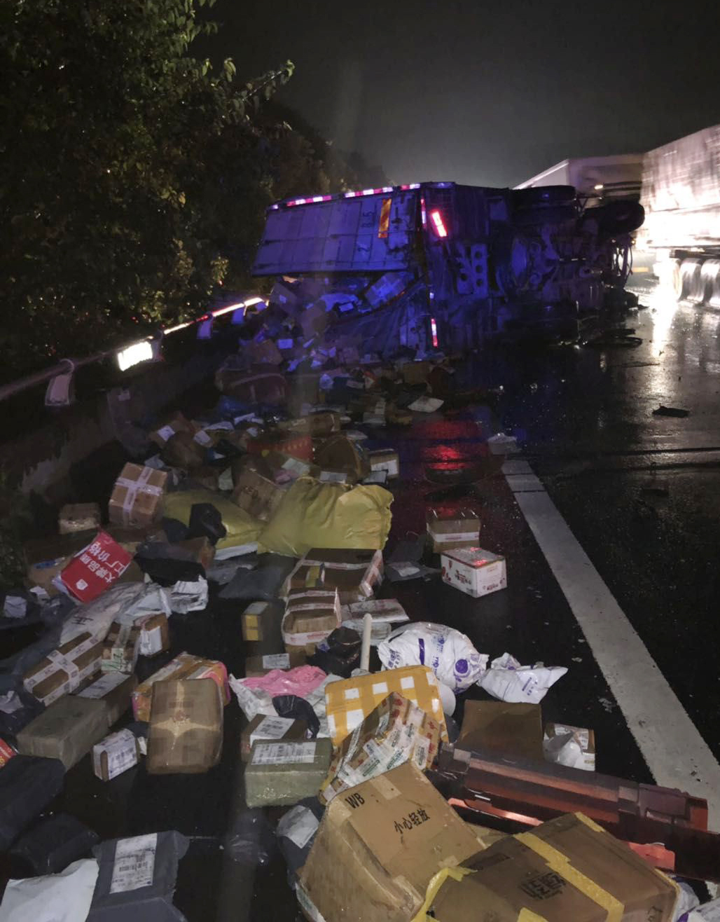 7月14日凌晨1點(diǎn),溫州方向臺(tái)州南收費(fèi)所附近,一輛半掛型大貨車和一輛快遞車相撞,半掛車直接沖出高速,四腳朝天??爝f車則是被巨大的沖擊力撞向了硬路肩,側(cè)翻中撒下數(shù)十米的貨物。1點(diǎn)10分,救援車輛到達(dá)現(xiàn)場(chǎng),現(xiàn)場(chǎng)一片狼藉,防撞護(hù)欄板、護(hù)欄柱損傷嚴(yán)重,橋梁鋼管都折斷了不少。