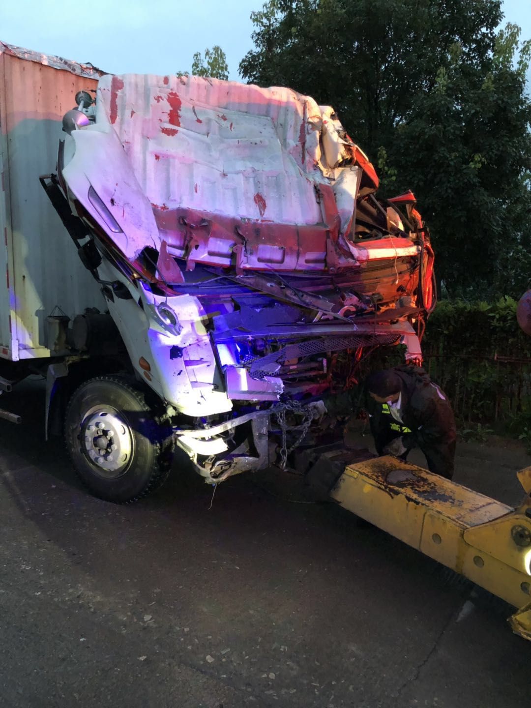 4點(diǎn)30分,快遞車被成功拖離高速,兩人回到現(xiàn)場(chǎng)開始對(duì)半掛車進(jìn)行救援。經(jīng)過2個(gè)多小時(shí)的不斷調(diào)整、嘗試,盡管出動(dòng)了兩輛吊車,但是半掛車的車頭死死地卡在樹里,吊車的力量無法撼動(dòng)。“砍樹!”最原始的方法往往是最有效的方法。一群人馬上拿工具把卡住車的部分砍斷。