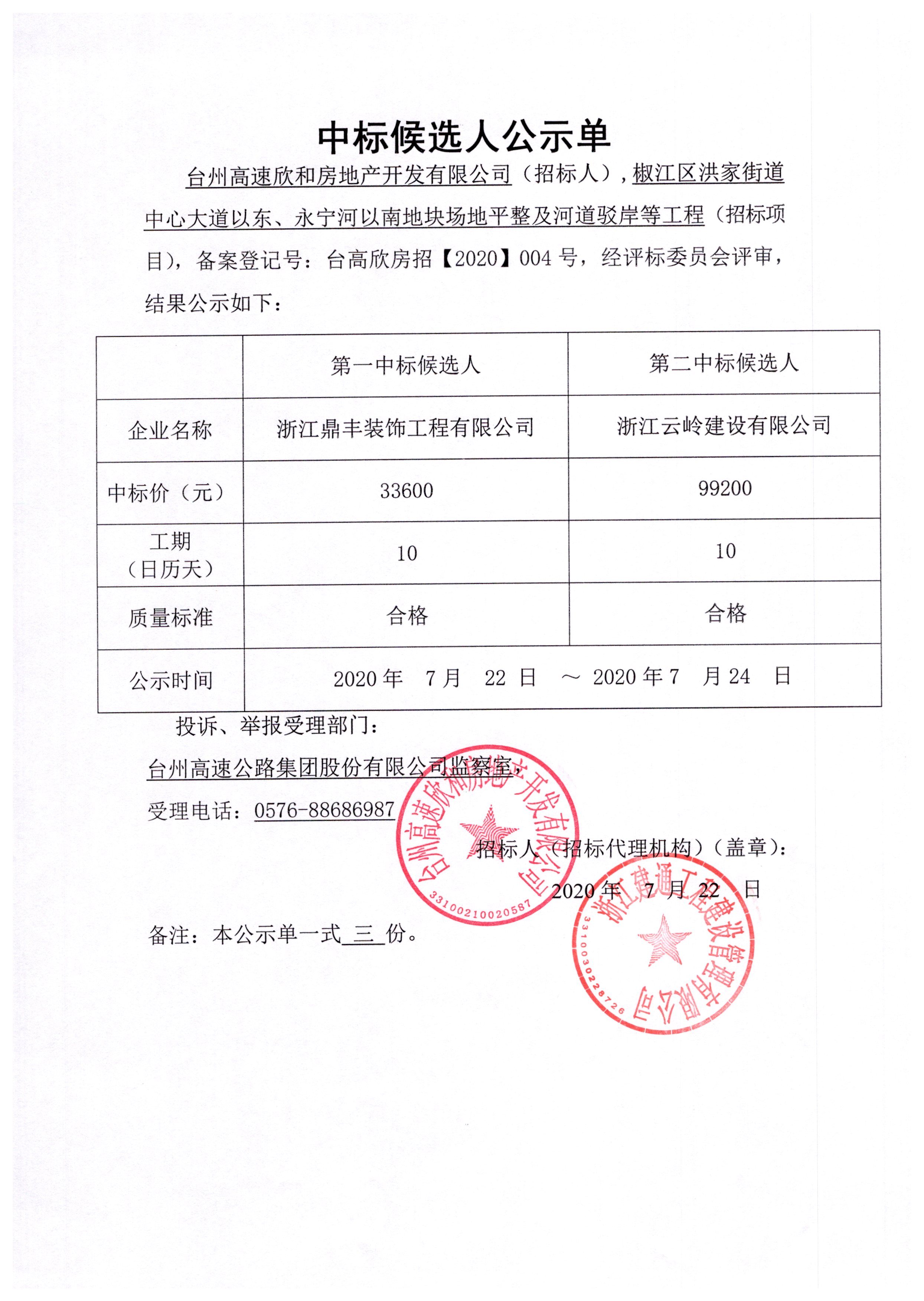 椒江區(qū)洪家街道中心大道以東、永寧河以南地塊場地平整及河道駁岸等工程(招標(biāo)項目)中標(biāo)候選人公示單