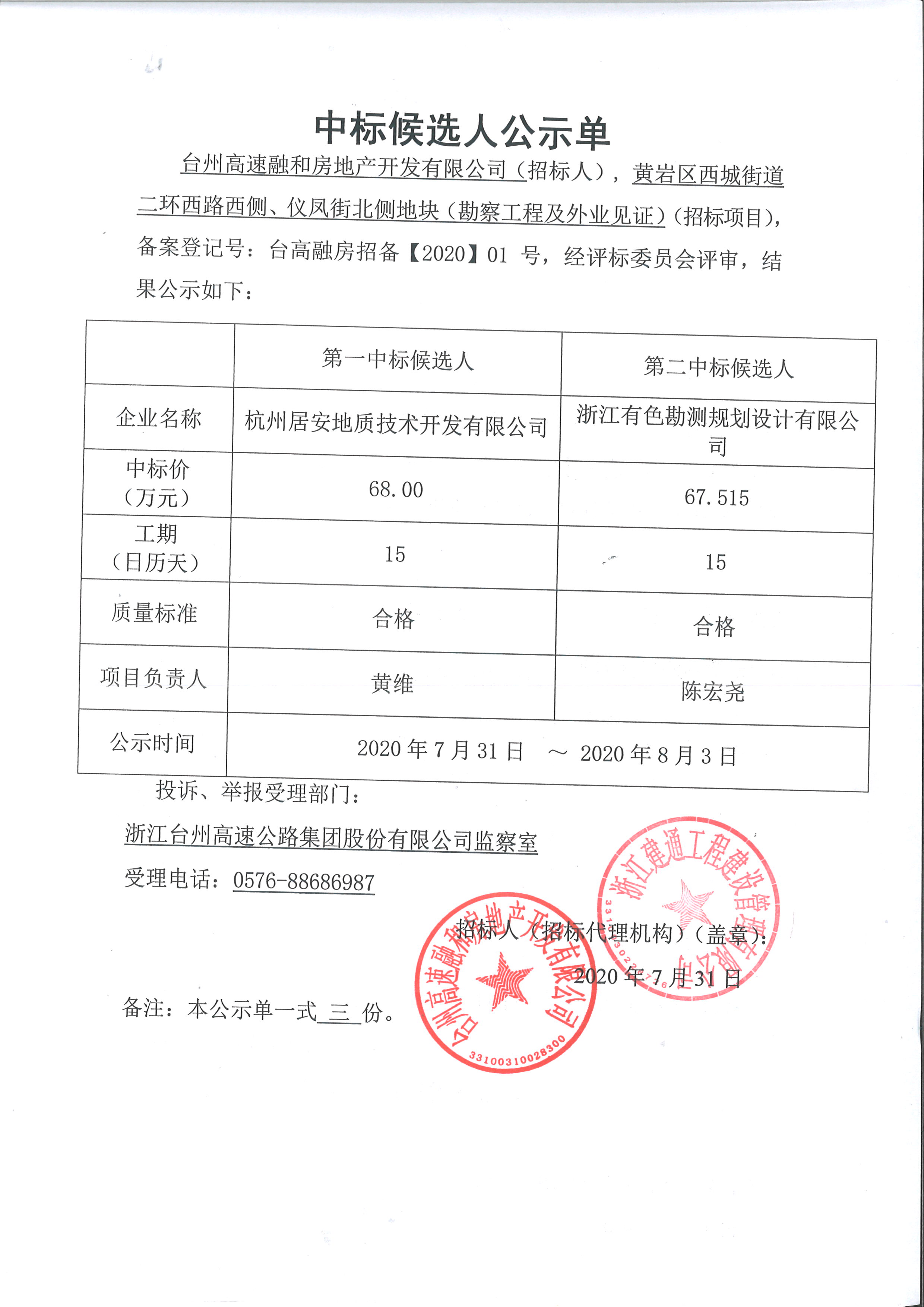 黃巖區(qū)西城街道二環(huán)西路西側(cè)、儀鳳街北側(cè)地塊(勘察工程及外業(yè)見(jiàn)證)中標(biāo)候選人公示單