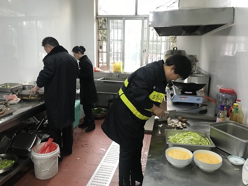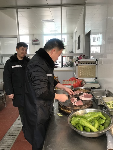 圖為工作人員幫忙做飯 臨近春節(jié)又正值春運(yùn)期間,一時(shí)也找不到人員替代。為了保證員工正常用餐,中午,楊瑩瑩決定親自下廚為員工做飯,冰冷的水里直接洗菜,掄起廚刀剁肉切菜,卷起袖子熱鍋炒菜,儼然成為合格的大廚。副所長(zhǎng)周超、杜佳自動(dòng)加入司廚行列,其他行政人員在一旁配合摘菜、剝蒜等等,正在休息的班組其他人員見狀也紛紛前來(lái)幫忙。這一刻,小小廚房其樂融融,那是家的味道。午餐過(guò)后,楊瑩瑩又開始考慮晚餐和明天的早餐,但是她不再發(fā)愁,因?yàn)樯砗筮€有無(wú)數(shù)個(gè)他們。