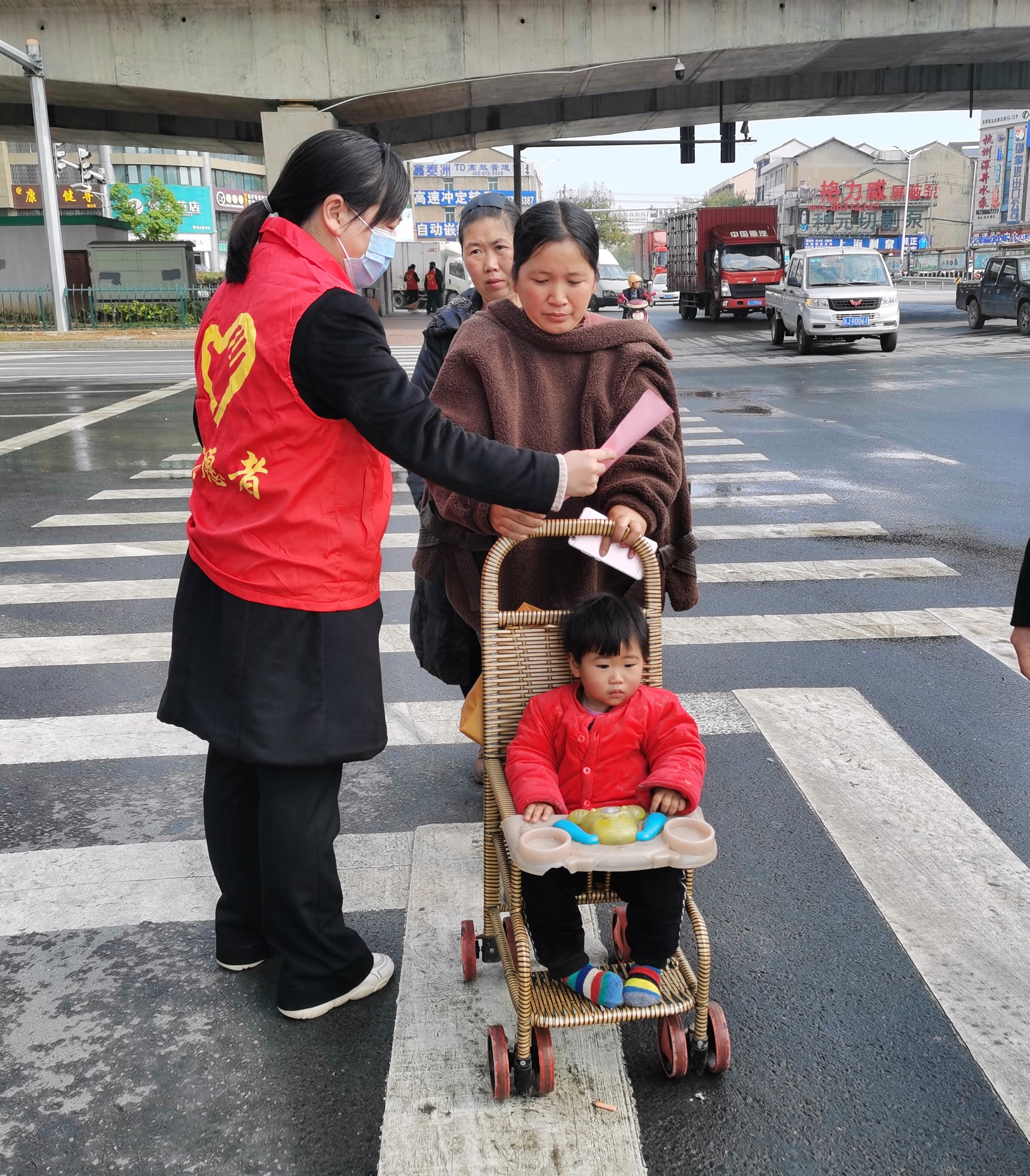 (圖為志愿者們向過往行人分發(fā)倡議書)