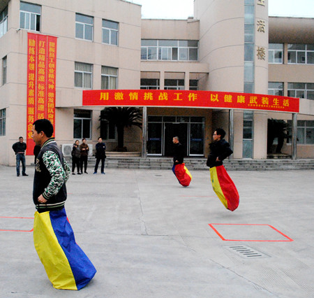 圖為“跳袋鼠”比賽 上午9點(diǎn)整,隨著臺(tái)州收費(fèi)所所長、分工會(huì)會(huì)長王小勇的一聲令下,趣味競技活動(dòng)正式拉開帷幕。此是自分工會(huì)成立以來第一次組織的妙趣橫生的集體活動(dòng),參加人員個(gè)個(gè)摩拳擦掌、躍躍欲試,有的迫不及待地在一旁先練開了。 此次趣味活動(dòng)本著“重在參與、愉悅身心、全民健身”的原則,以豐富員工健康向上的業(yè)余文化生活為目的,分集體和個(gè)人兩種比賽方式。集體項(xiàng)目有“二龍戲珠”、“齊心協(xié)力”、“我是喬丹”、“集體跳繩”共4項(xiàng);個(gè)人項(xiàng)目有“絕對公平”、“夾豆比賽”、“單人跳繩”、“跳袋鼠”、“車輪滾動(dòng)”共5項(xiàng)。在集體項(xiàng)目中,各隊(duì)配合默契,勇往直前;單人賽中,各位員工積極參與,有幾個(gè)為爭第一不小心摔倒,手掌擦破了皮,褲子摔破了也絕不放棄,爬起來繼續(xù)參加比賽,堅(jiān)持到最后。