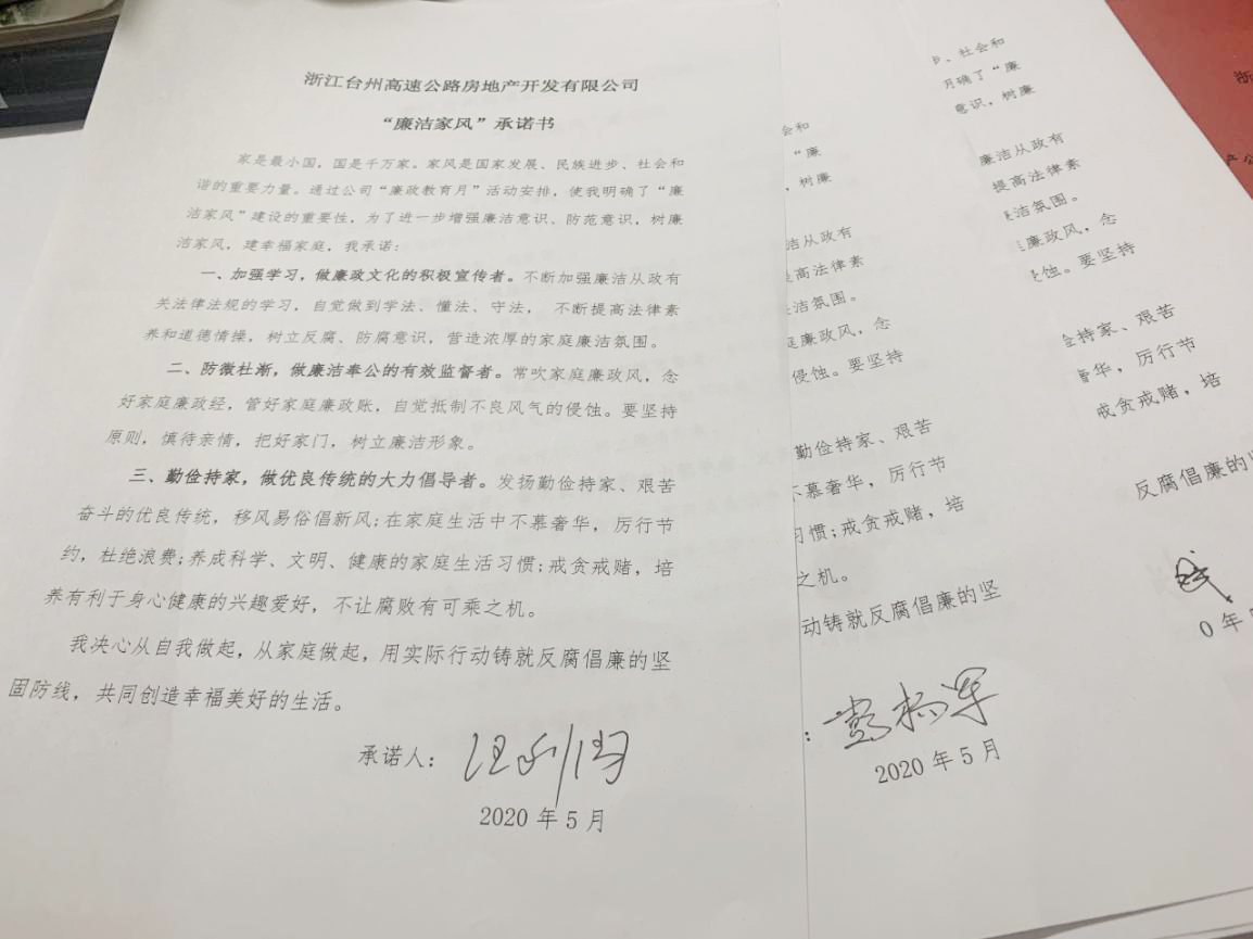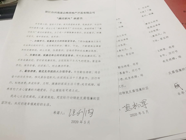 圖為全體黨員觀看廉政教育短視頻《國畫》  圖為簽訂“廉潔家風”承諾書 根據集團公司《關于組織開展“廉政教育月”活動的通知》文件要求,為推動“不忘初心、牢記使命”主題教育常態(tài)化,深入學習貫徹黨的十九大和十九屆二中、三中、四中全會及十九屆中紀委四次全會精神,嚴守黨的政治紀律和政治規(guī)矩,更好地落實黨風廉政建設有關要求,高速房產公司黨支部組織了這次專題活動。全體參會人員一起觀看廉政教育視頻,宣讀“廉潔家風”倡議書,簽訂“廉潔家風”承諾書,開展“廉潔文明家風,黨員干部示范”大討論。 此次黨風廉政專題活動進一步增強了黨員干部的廉潔意識、防范意識,起到帶頭正品行、立家規(guī)、嚴家教、樹家風建設的表率作用,以好家風促黨風帶社風民風,為新形勢下臺州高速房產事業(yè)貢獻力量。 鄭攀